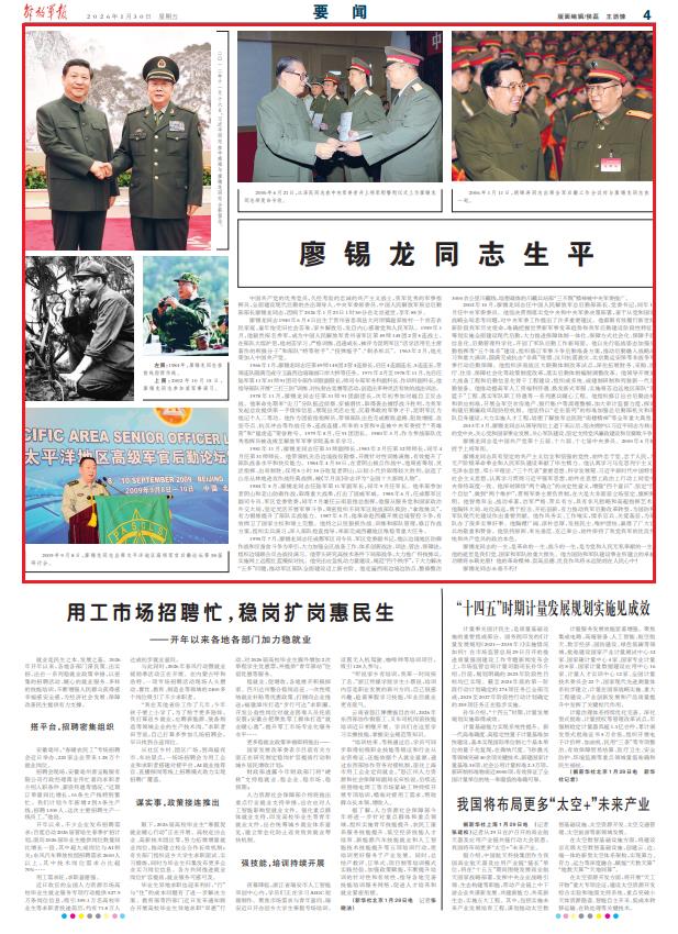 中国共产党的优秀党员,久经考验的忠诚的共产主义战士,我军优秀的军事指挥员,全面建设现代后勤的杰出领导人,中央军委原委员、中国人民解放军原总后勤部部长廖锡龙同志,因病于2026年1月23日1时50分在北京逝世,享年85岁。
