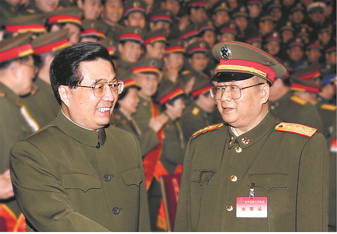 2006年1月11日,胡锦涛同志出席全军后勤工作会议时与廖锡龙同志在一起。