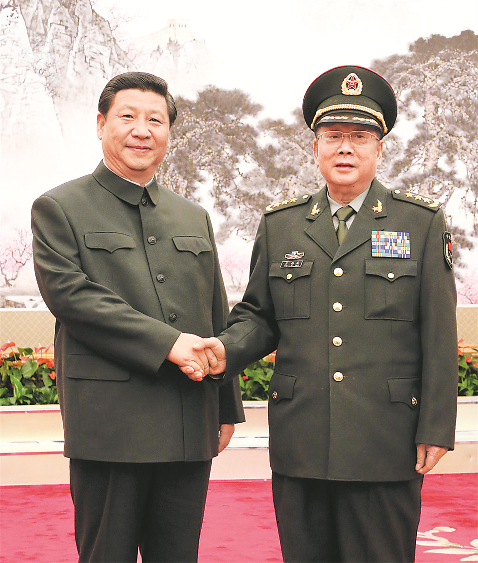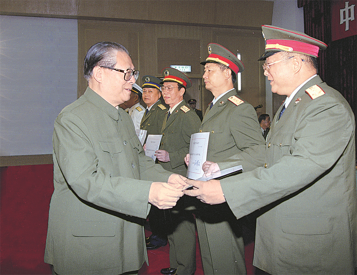 2000年6月21日,江泽民同志在中央军委晋升上将军衔警衔仪式上为廖锡龙同志颁发命令状。