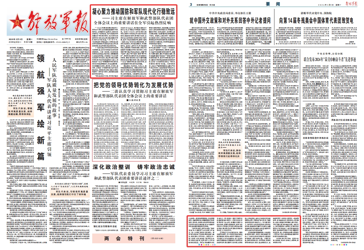(解放军报北京3月8日电 记者朱宏博、孙炜航、吴安宁、李由之、向黎鸣、武诗韬等采写)