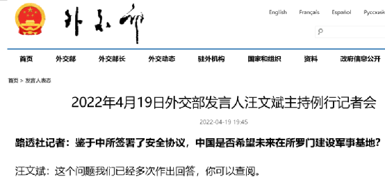 在4月19日的外交部记者会后,有上会记者就对笔者表示,路透社的记者一直在带着预设立场就此事不断碰瓷外交部发言人,问中国是不是要在所罗门群岛建设军事基地。对此,外交部发言人礼貌地表示让他回去查之前中方的表态。